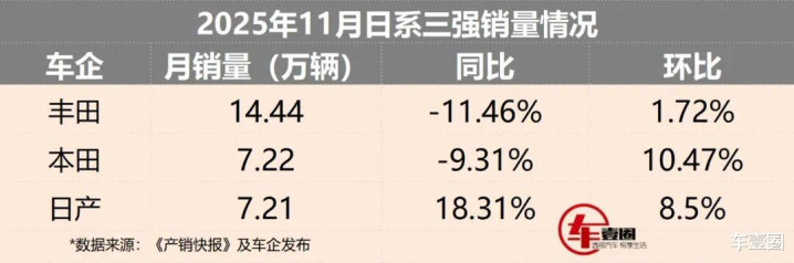 乘联会最新数据显示:今年11月,全国乘用车市场零售销量同、环比双双下降,但批发销量仍呈现同、环比小幅增长走势。在这样的市场大环境下,合资品牌中之日系三强仍可谓是各有悲喜,其重点车型的市场表现也受到了更多关注。下面,圈哥就带大家去盘点一番。